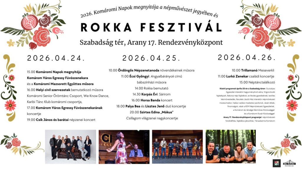 Április 24-én pénteken a Rokka Fesztivál keretében 15 órakor a Komáromi Napok megnyitójára várnak mindenkit a Szabadság téren. Hagyományosan műsort ad Komárom Város Egressy Fúvószenekara és a Komáromi Mazsorett Együttes. A megnyitót követően 16 órától a Helyi civil szervezetek bemutatkozó műsorát, a Komáromi Senior Örömtánc Csoport, We Know Dance, Karibi Tánc Klub komáromi csoportjának műsorát láthatják az érdeklődők. 17 órakor Komárom Város Egressy Fúvószenekarának koncertje, 19 órától Csík János és barátai népzenei koncertje vár mindenkit.