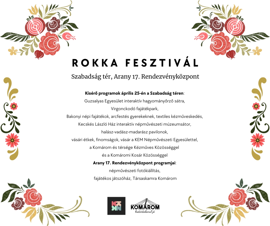 Április 26-án, vasárnap 10 órától a Trillamanó Meseverkli, 11.00 órakor a Lurkó Zenekar családi koncertje várja a családokat. A Rokka Fesztivál 15 órától Néptánctalálkozóval zárul.