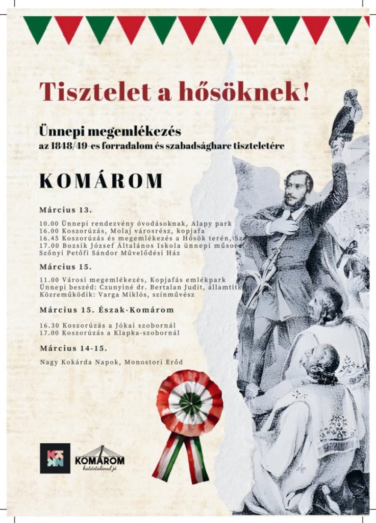Ünnepi megemlékezés Komáromban, az 1848/49-es forradalom és szabadságharc tiszteletére. Nemzeti ünnepünk alkalmából programok sorozata várja a komáromiakat. Városunkban már március 13-án pénteken megkezdőnek az ünnepi programok. Hagyományosan a komáromi óvodásokat 10 órakor az Alapy Gáspár parkban várja a március 15-ei ünnepi megemlékezés.