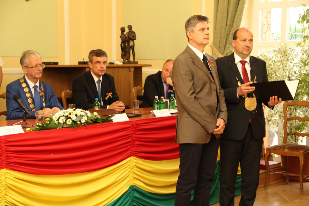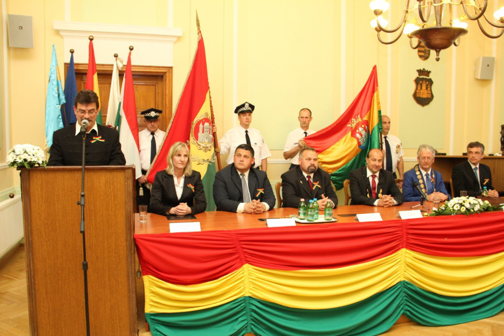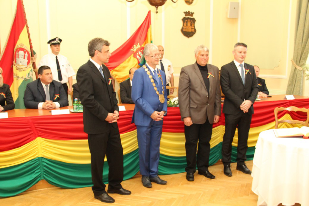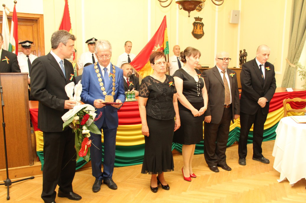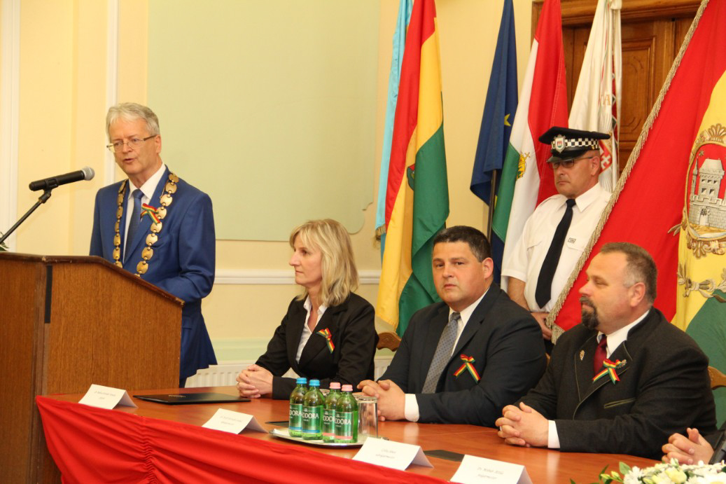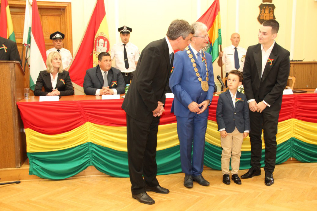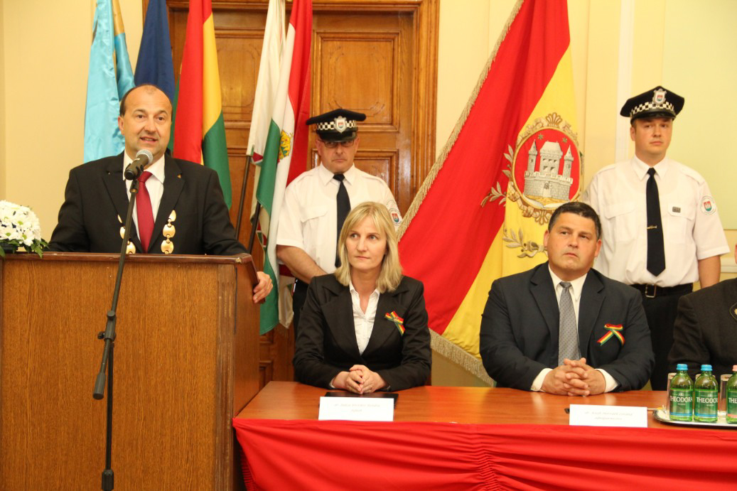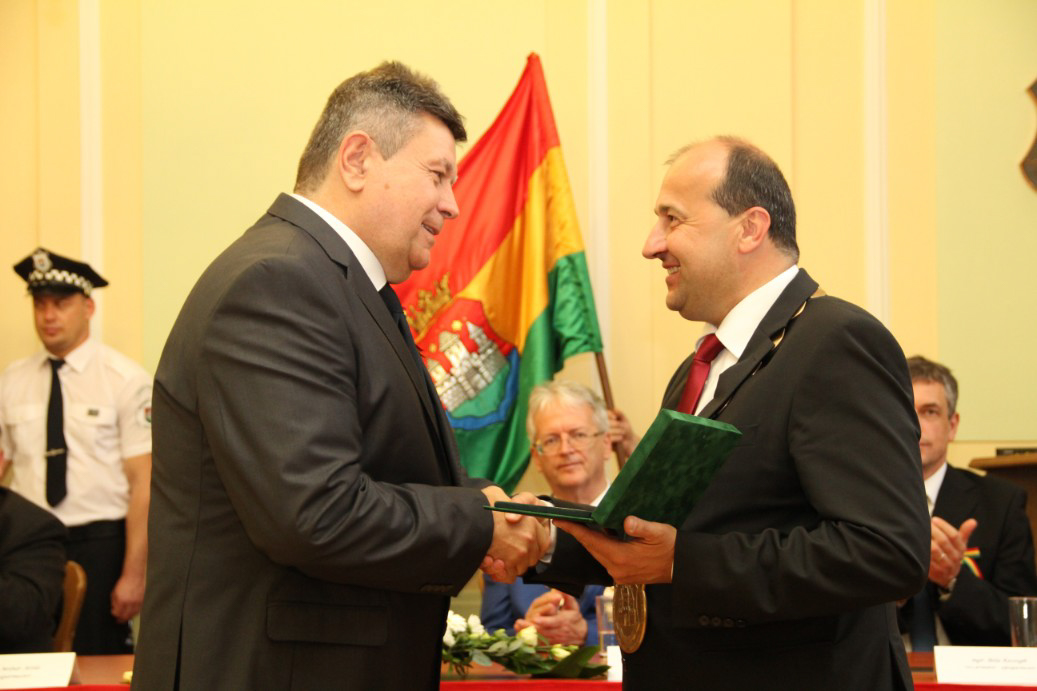 Észak- és Dél-Komárom képviselő testületei április 26-án, a komáromi csata emléknapján idén is megtartották együttes ünnepi testületi ülésüket, ezúttal a Duna déli partján, a Városháza dísztermében. A hivatalos ceremónián került sor a díszpolgári kitüntető cím, a Pro Urbe-, valamint a polgármesteri díjak átadására.